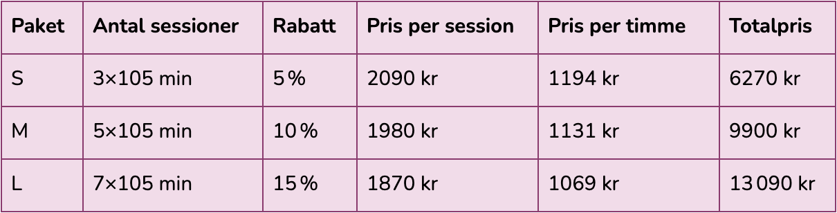 Boka enskilda sessioner eller paket, med kostnadsfri konsultation som första steg.